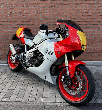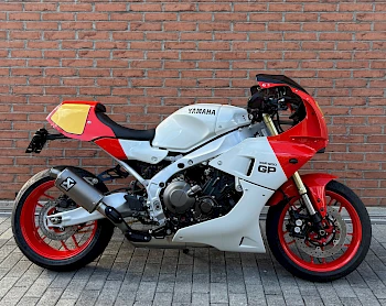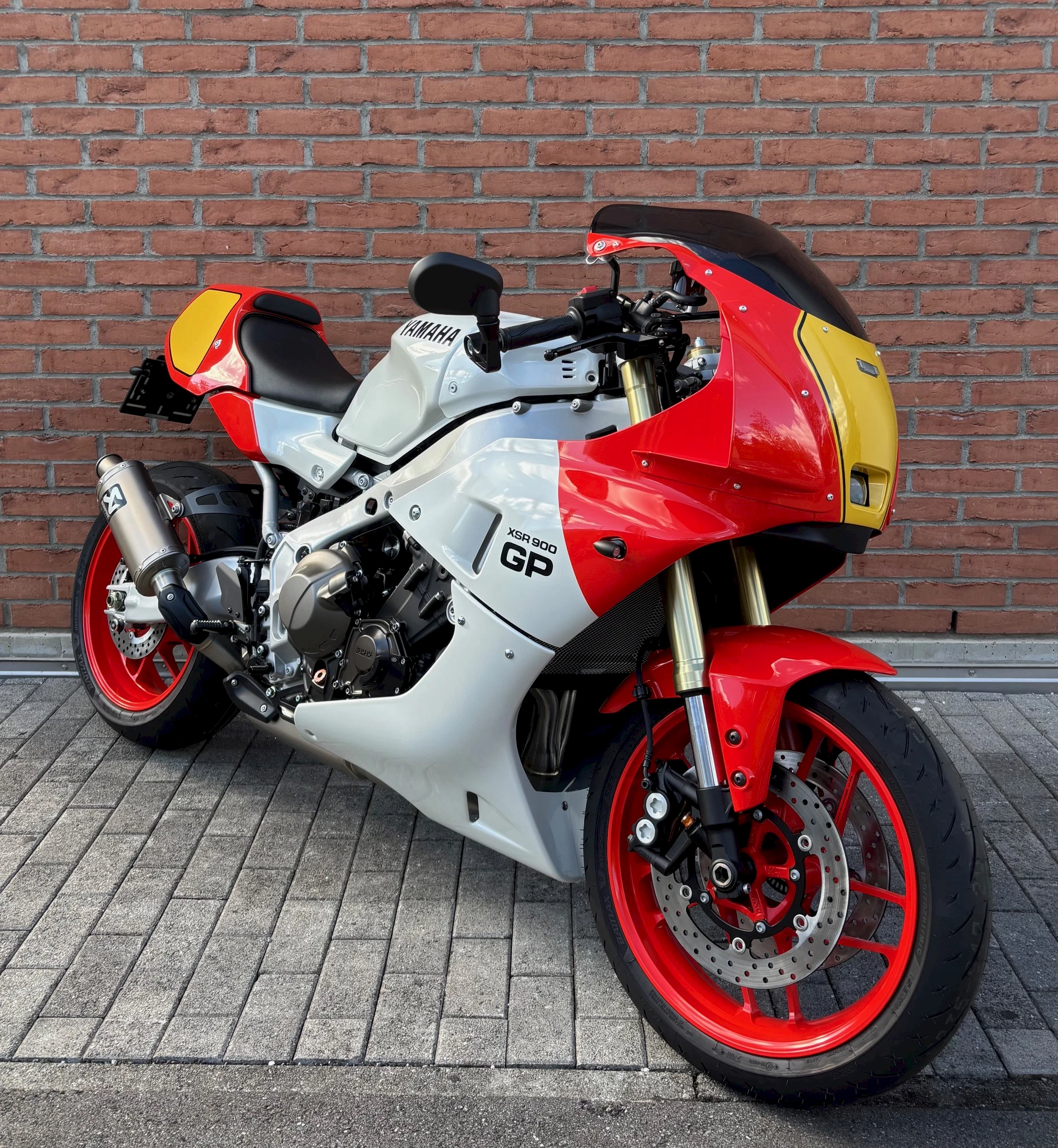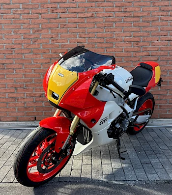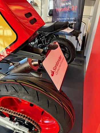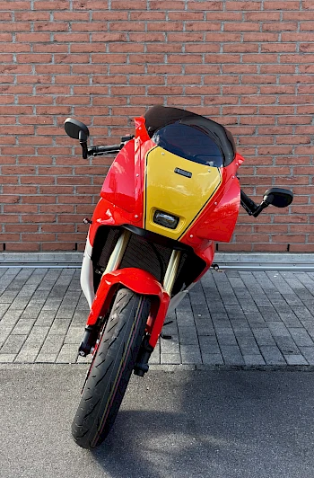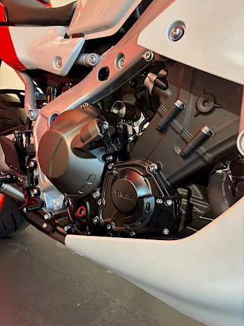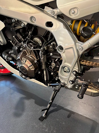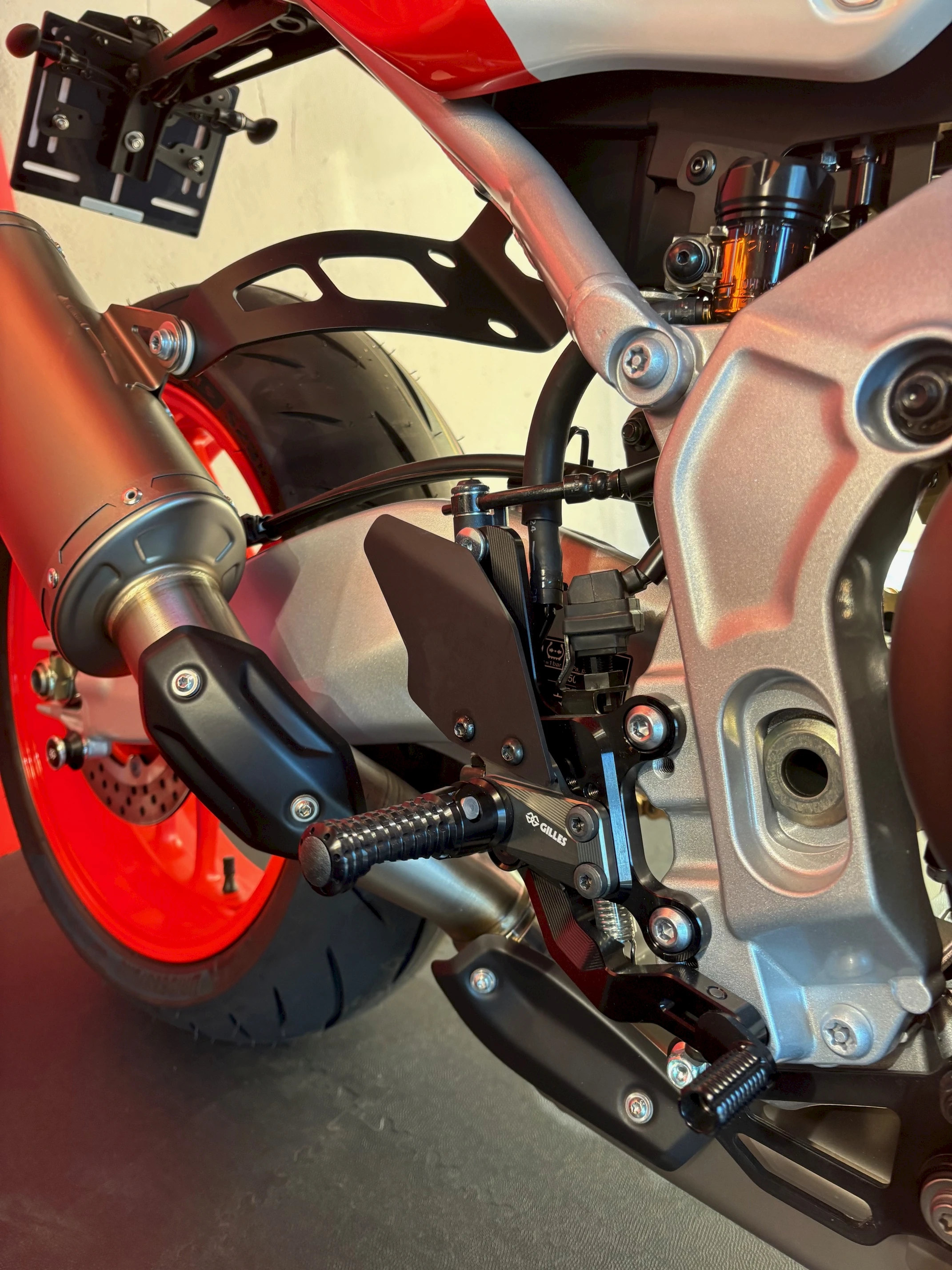 Rizoma Kurzheck Kennzeichenhalter, ProFrame2 Kennzeichenrahmen, Rizoma LED Blinker, Vollverschalung, getönte Verschalungsscheibe, Akrapovic Auspuffanlage, goldige Antriebskette, Gilles Tooling Fussrasteranlage, Billet Brems- und Kupplungshebel, Kühlerschutz, Billet Motorenschützer und Ritzelabdeckung.